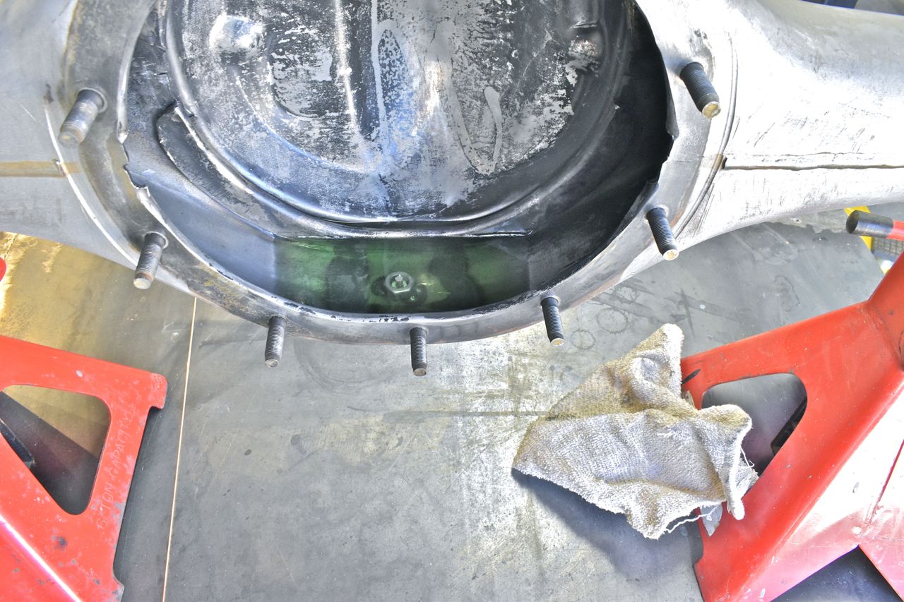 With the drain plug removed and the axle at roughly the angle as installed in the car, that's all the old oil that would be left. So this works really well for oil changes.