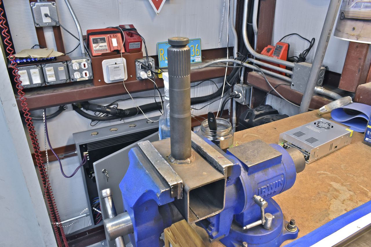 This is a jig I made to hold 28 spline differentials. This is made from a 28 spline Ford 8.8 axle shaft cut down and welded to square tubing.
