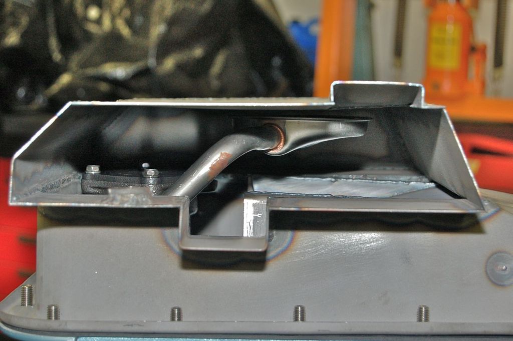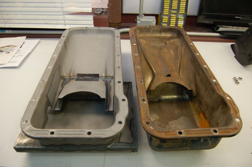 The one on the right is the original oil pan for this engine. The one on the left had a rust hole in the bottom of it. So it seemed rather providential to use it. So I sliced the bottom out of it and with some 16 gauge steel made the baffle and extension bits.