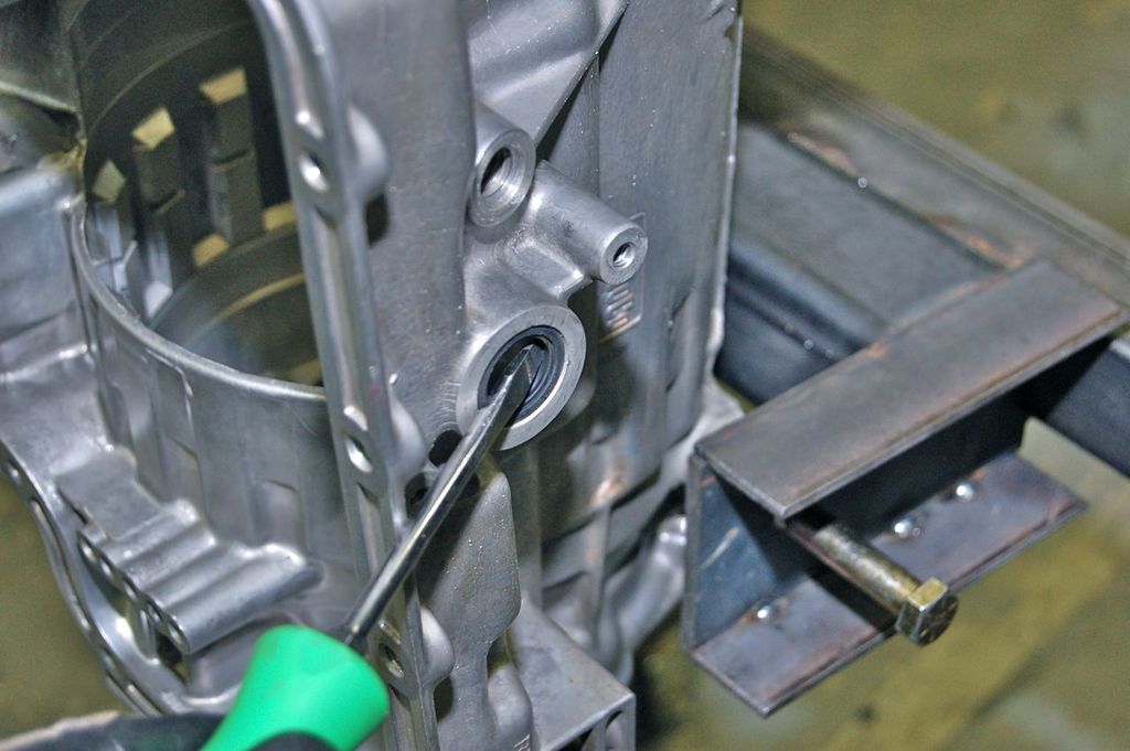 Remove the manual shaft seal. Use a blunt screwdriver if you do not feel comfortable in controlling it to avoid scratching the aluminum case.