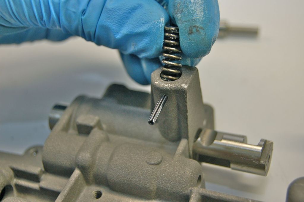 Use a small punch to hold the spring into place while the pin is drawn over the spring by pliers.