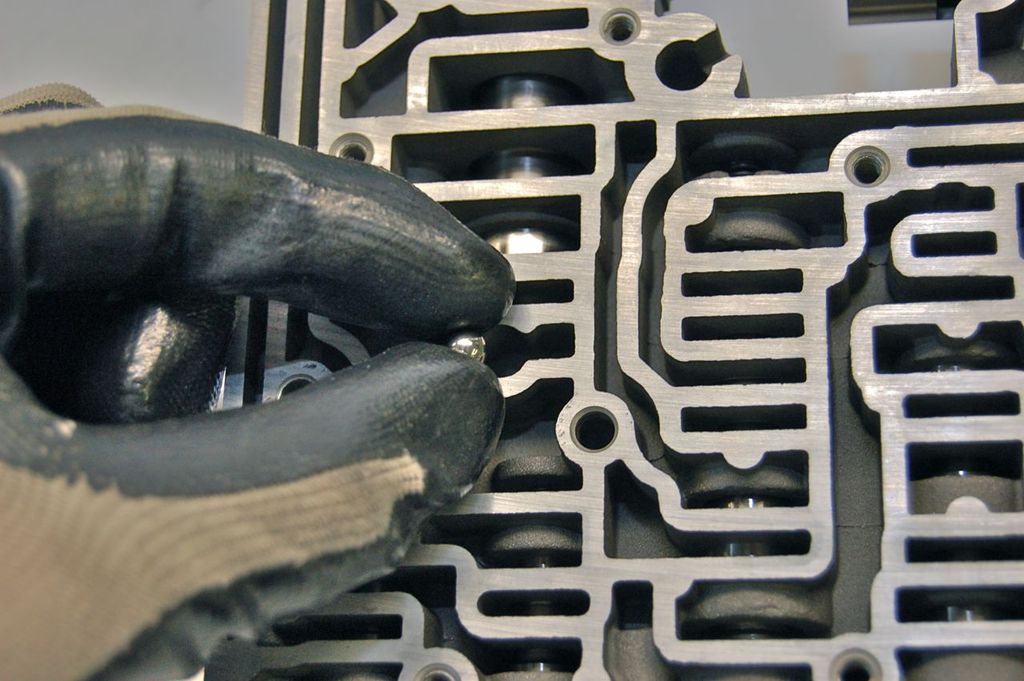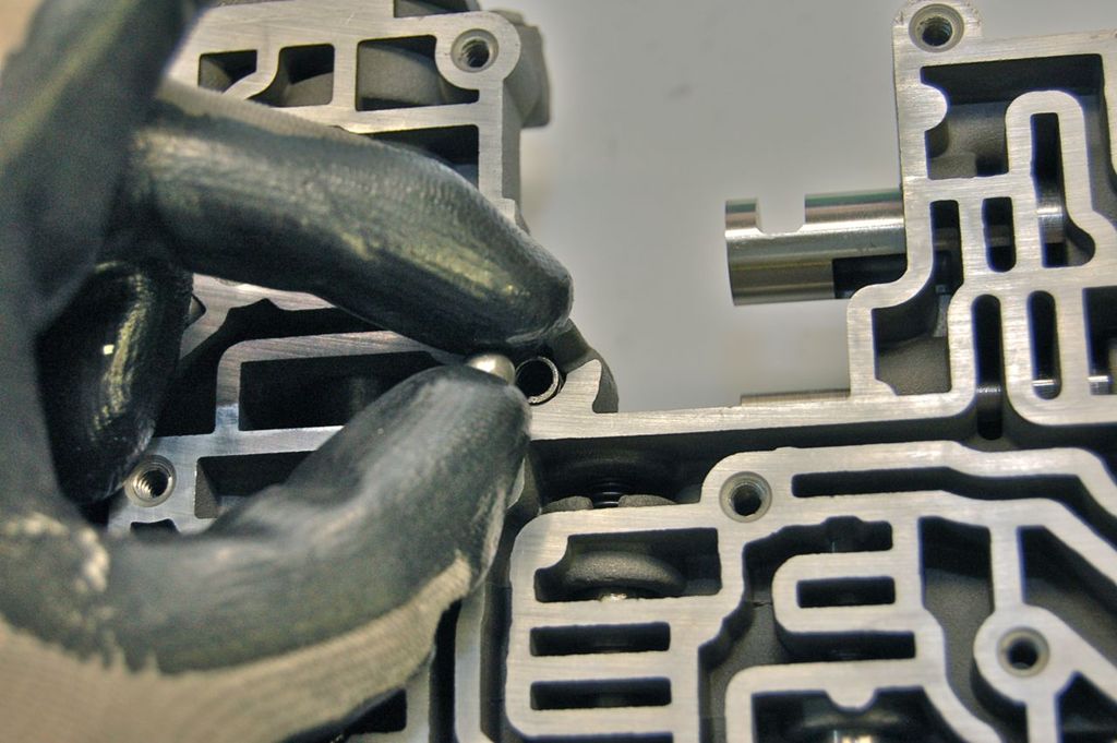 On the valve body side flipped over there are 2 check balls and a spring. This one is the 2-3 shift check ball.