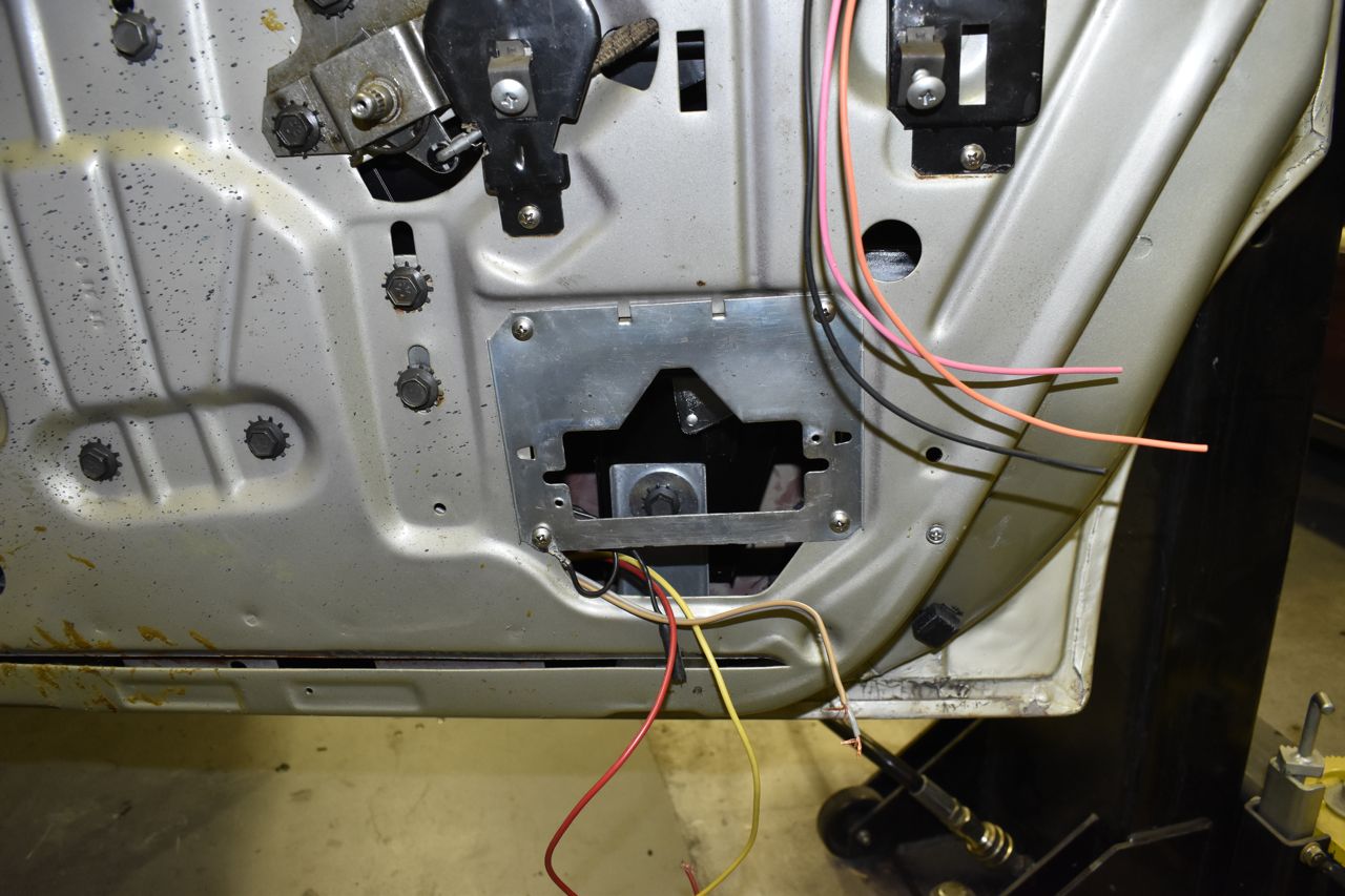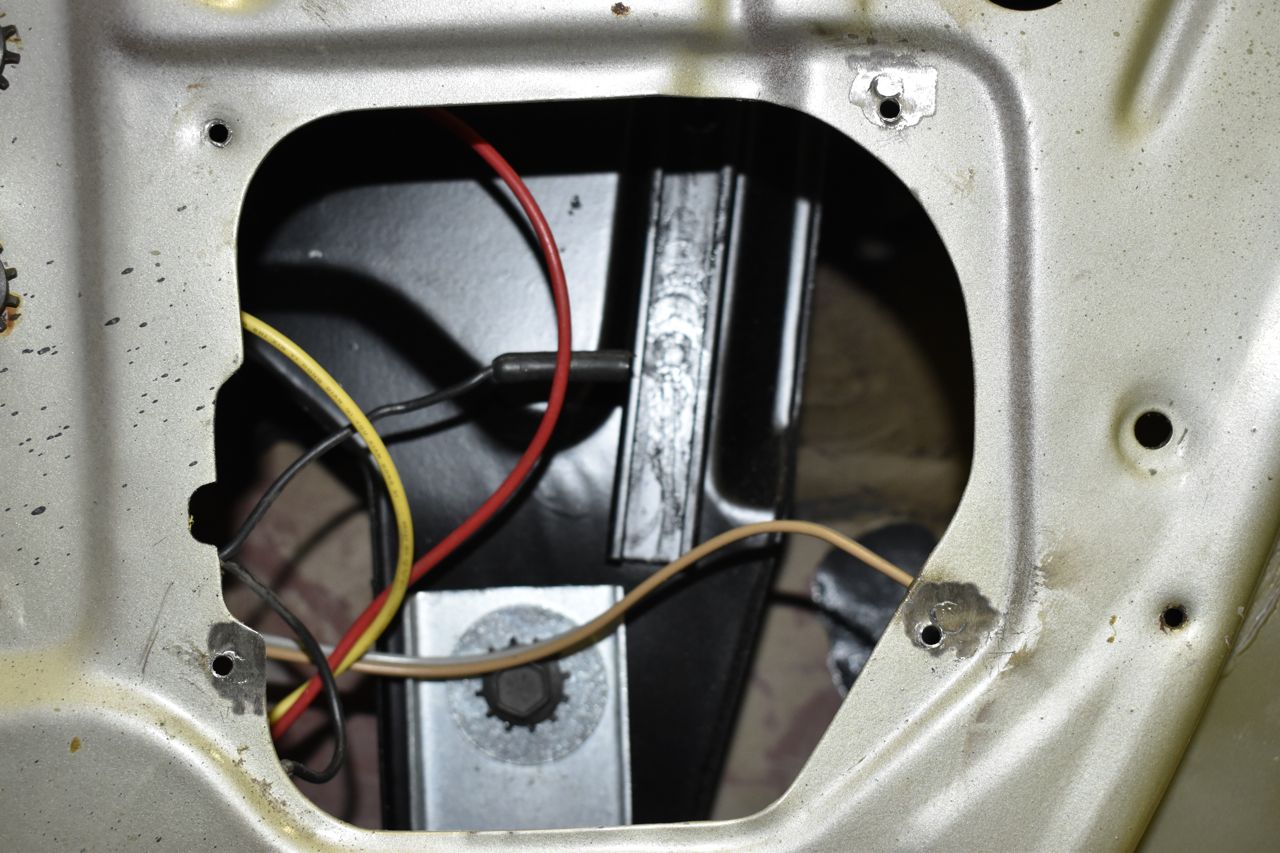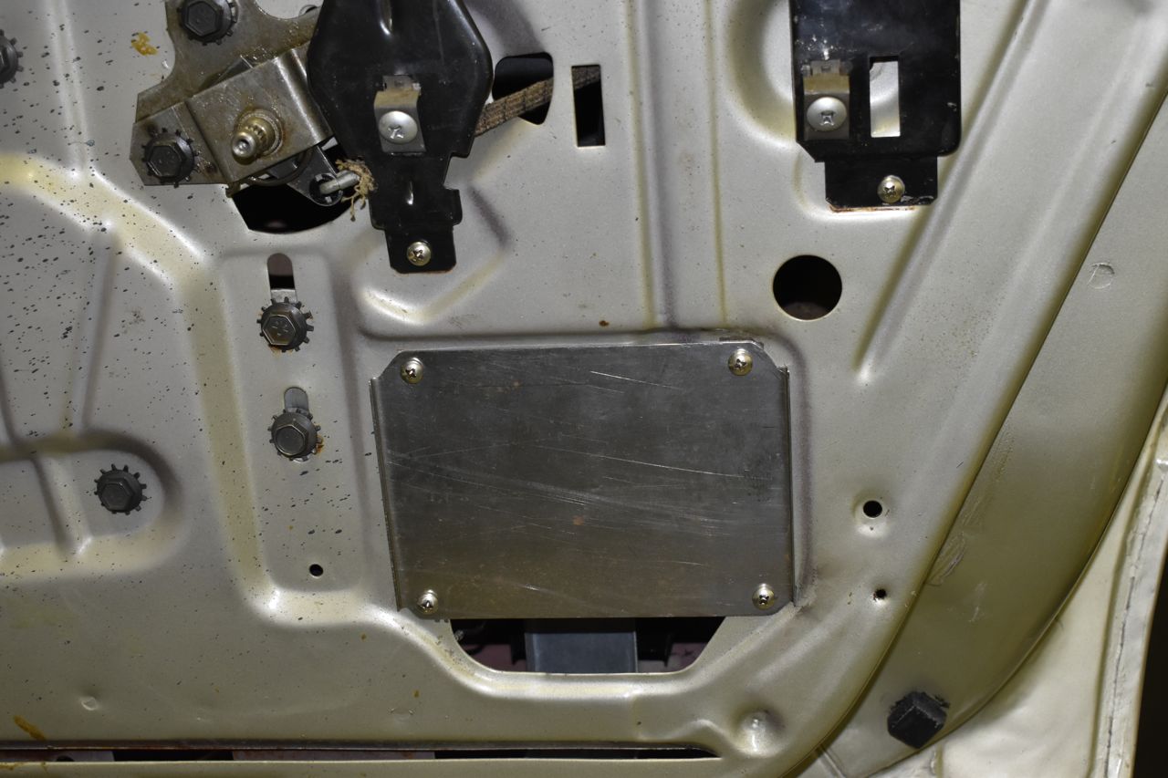 Starting here, this is the original mounting plate the OEM door lamp uses. It's installed with the characteristic indifference to auto assembly of the time. It's crooked. Such a poor execution, even though you can't see this when the door panel is on. It bothers me just knowing it plus the lens on the door panel is also crooked.