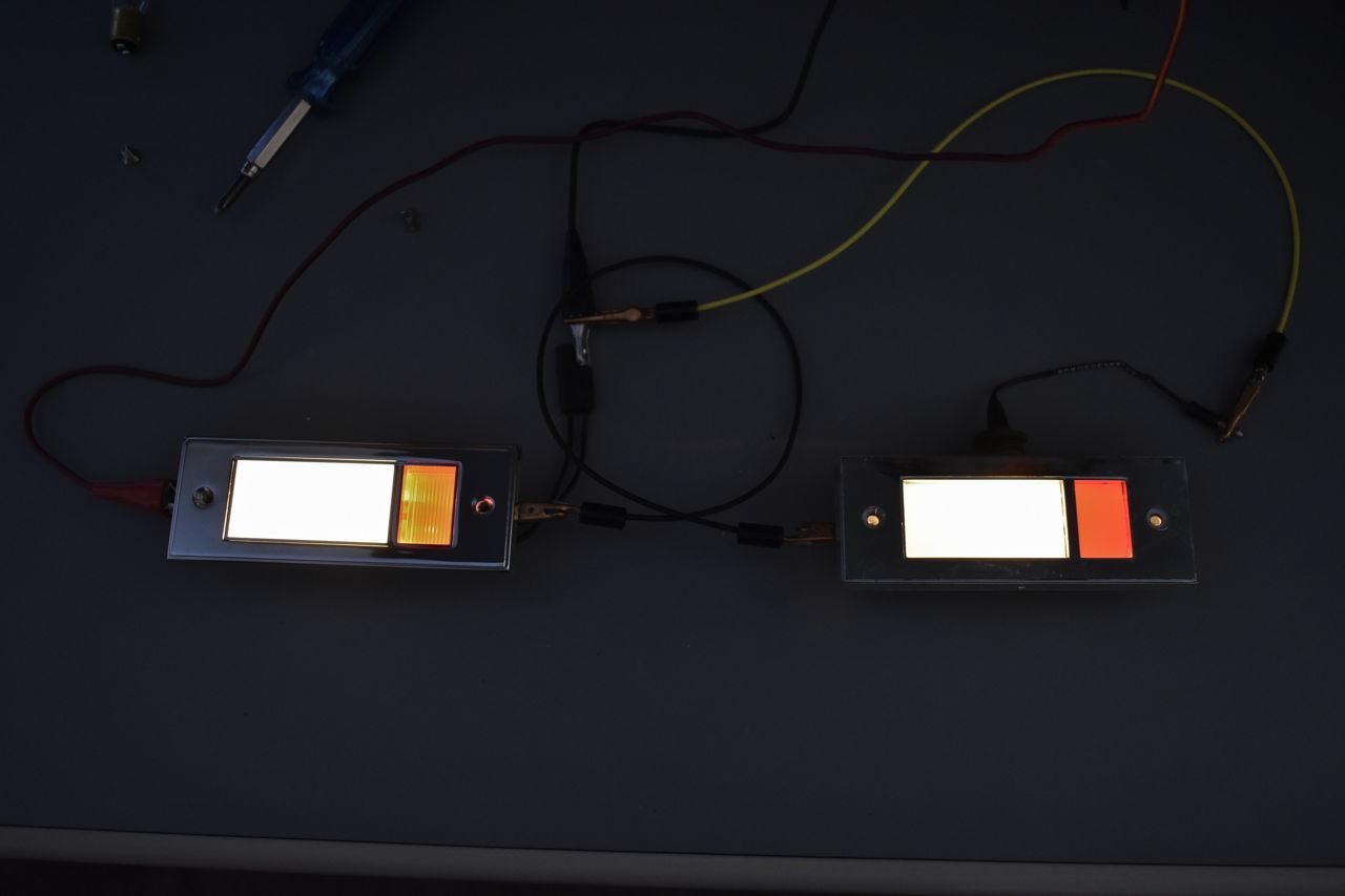 These do take different bulbs, both are bayonet but the Mustang uses the dual pin and the LTD a single pin. For a fair light test I stuffed the same single pin bulb in both.