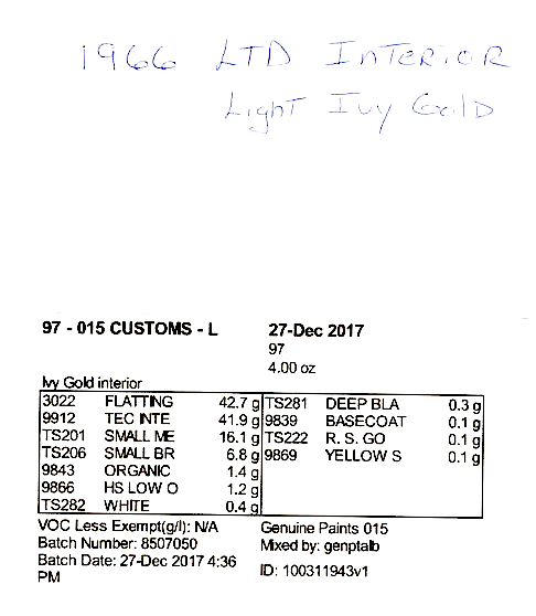 Sometimes Napa doesn't have the paint colour code you need. In this case they didn't. It's light Ivy Gold. The upside to this is usually on the reverse (hidden) side of an interior piece depending on where it was will be the correct virgin colour. We found the best piece and gave it to them for colour matching.