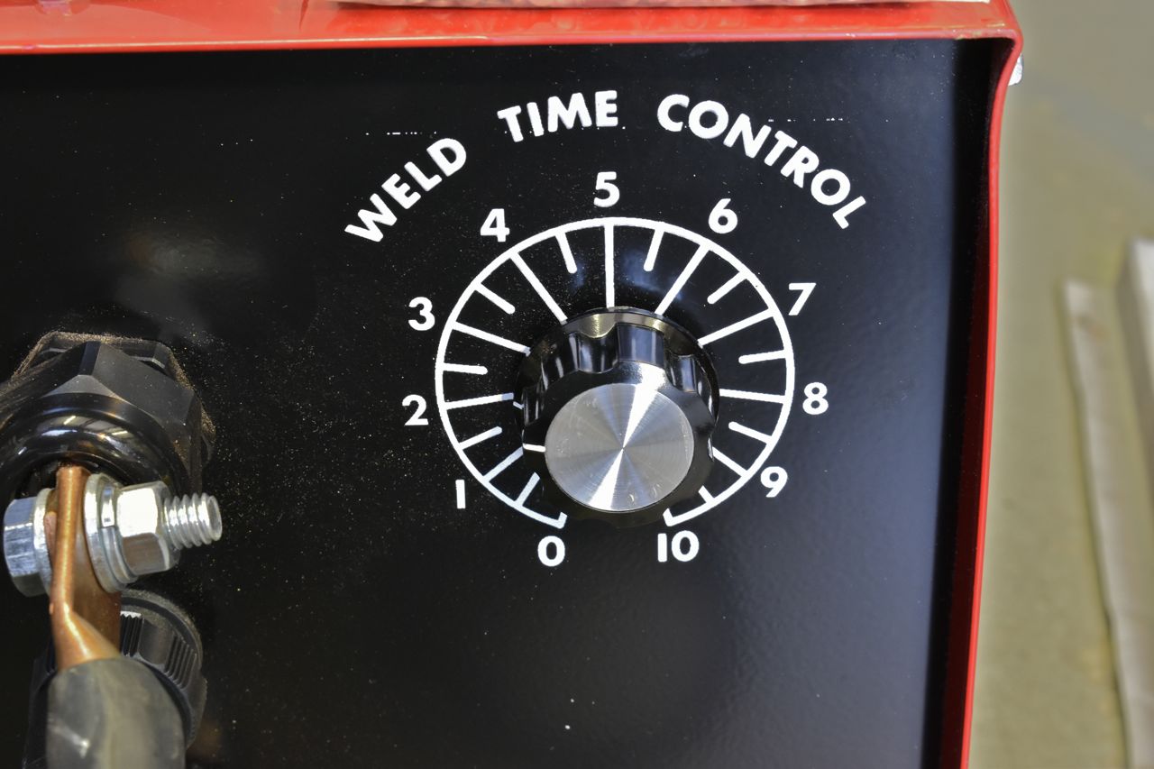 Did some experiments with scrap first. You can't adjust the current as it's fixed, but you can adjust the weld time. I think this machine puts out 3500 Amperes. I turned up the time and it just melted the little peg.