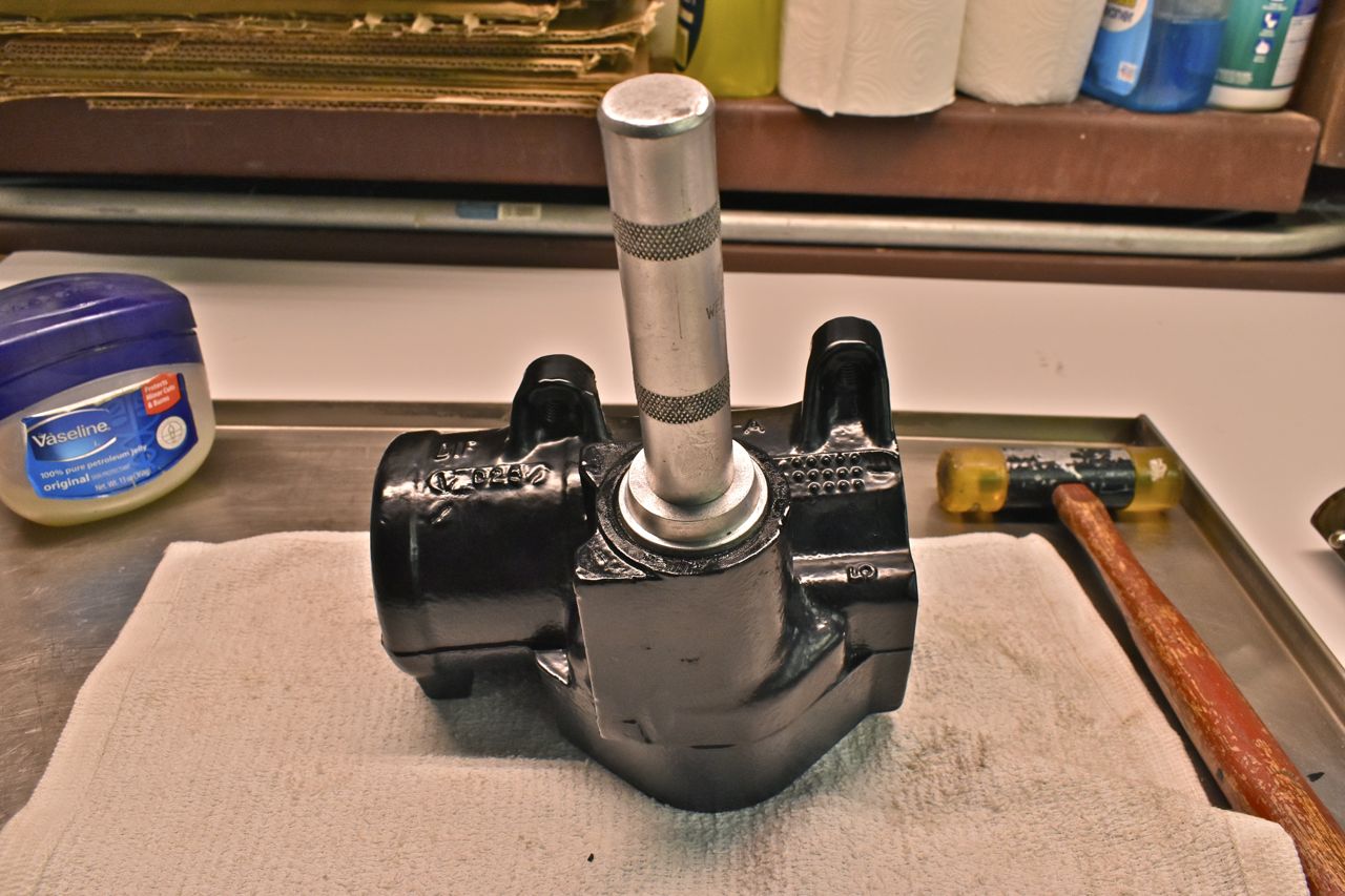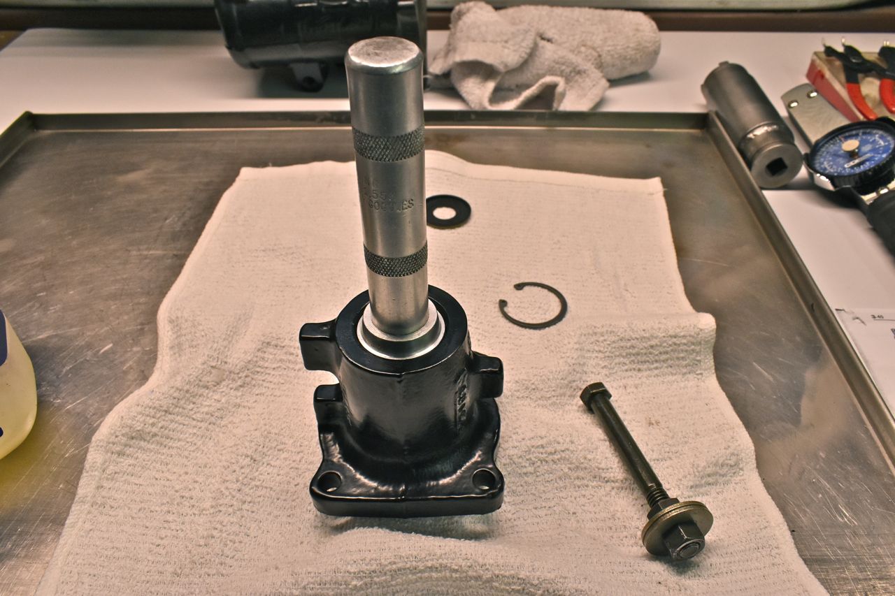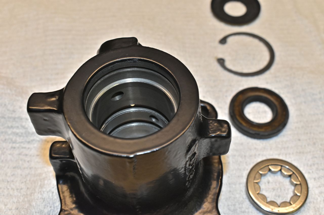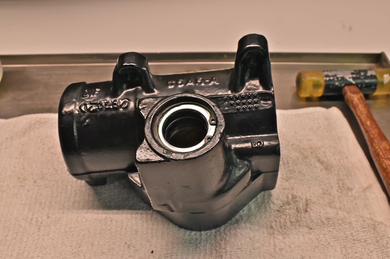 Use the largest driver that will safely fit without hitting the bore. I almost forgot to mention to use a liberal amount of Vaseline when assembling the innards. Now a word about these seals. There is no stop other than the bore lip for the bushing. However do not drive these all the way down. You want to drive these in just enough to get the snap ring on and no more. Now the pressures will seat the seals against the snap ring but if they have to travel any distance you risk damage or them not moving true and cocking off to the side and leaking.