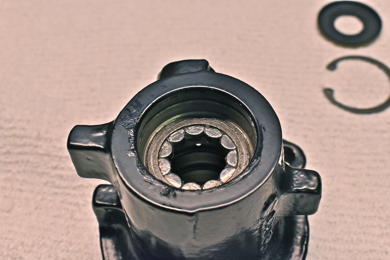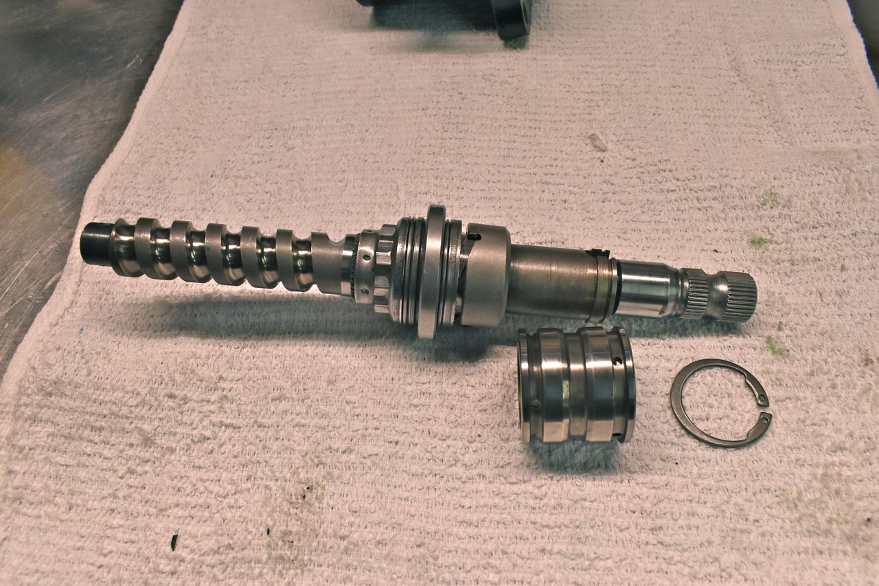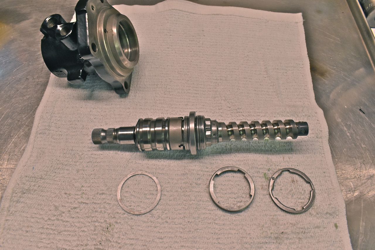 The thin washer on the left is actually a selective (calibration) washer that results in a neutral hydraulic balance with no steering input applied to the input shaft. This is needed because of the machining tolerances. This washer precisely locates that moveable spool valve in the bore in the housing at the top resulting in all the fluid going in and out the hoses with no flow diverted to the rack piston.