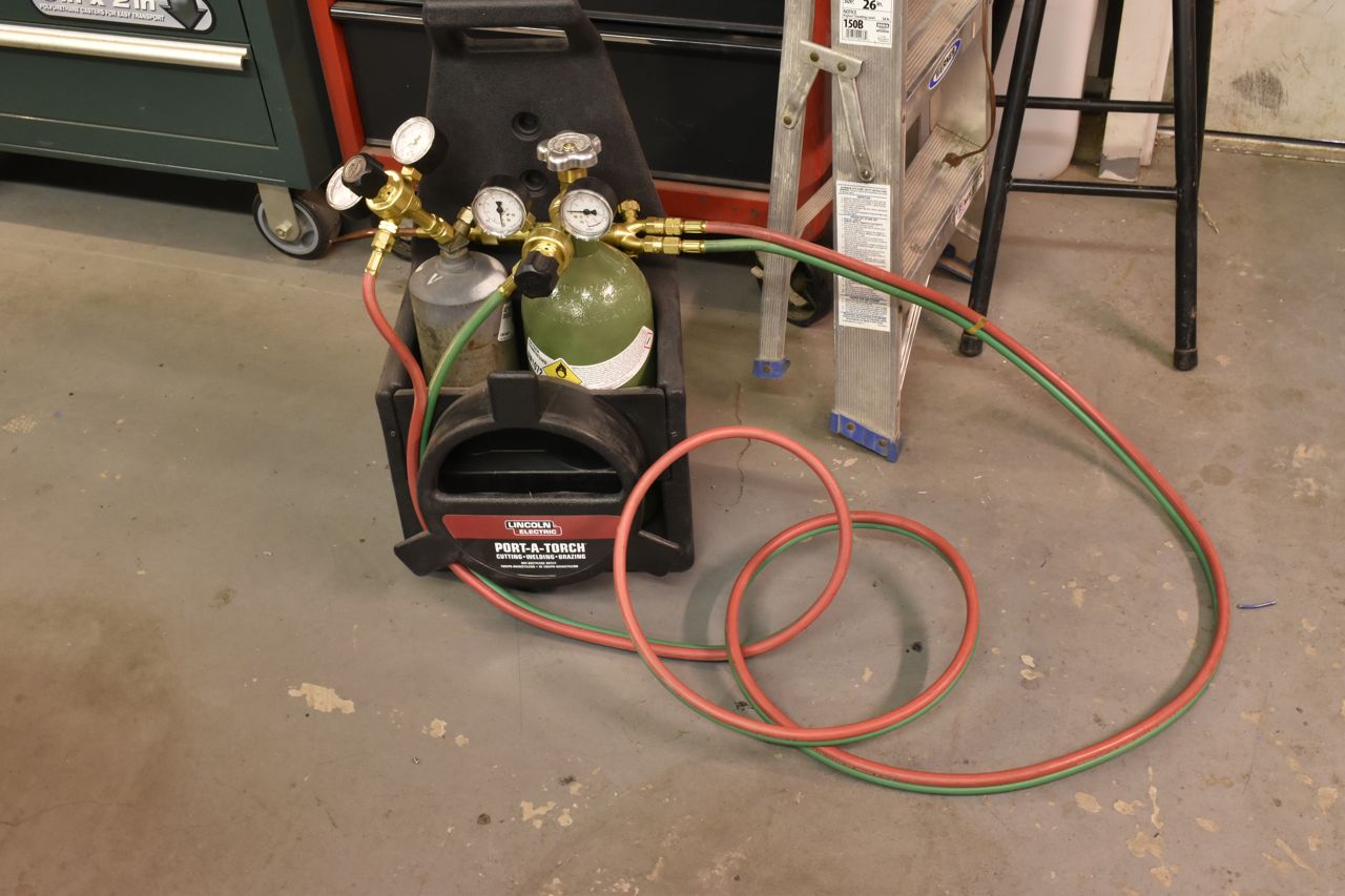 This is a small oxy-acetylene kit you can buy at chain stores. I don't use it much at all, except for times like this. All I can say is if you are unfamiliar with using these gases you MUST read the handling and setup instructions. Unless you want your last fleeting thought to be, so that's what the red arc on the acetylene gauge means. :eek: