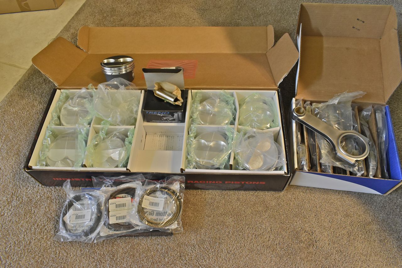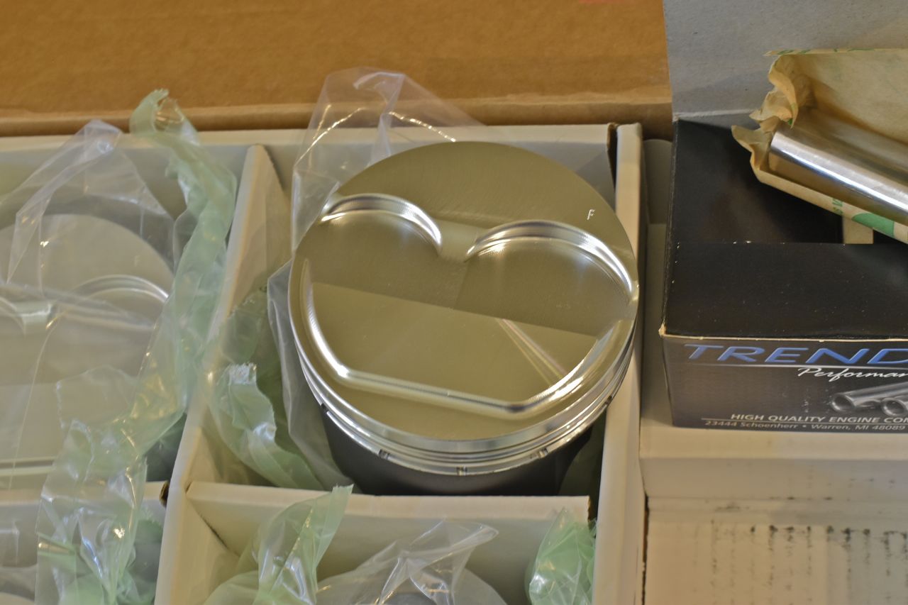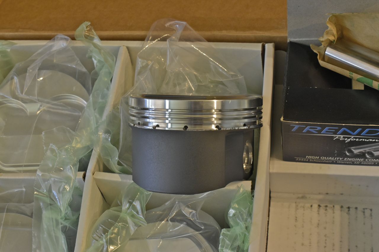 These are forged pistons with moly coated skirts, modern ring packs (1.5, 1.5, 3.0mm) and offset pins and a dome volume to yield 10.5:1 static compression with the heads and head gaskets I've chosen. The rings are moly coated with a gapless top ring. Also are new connecting rods.