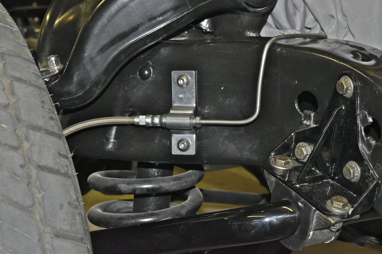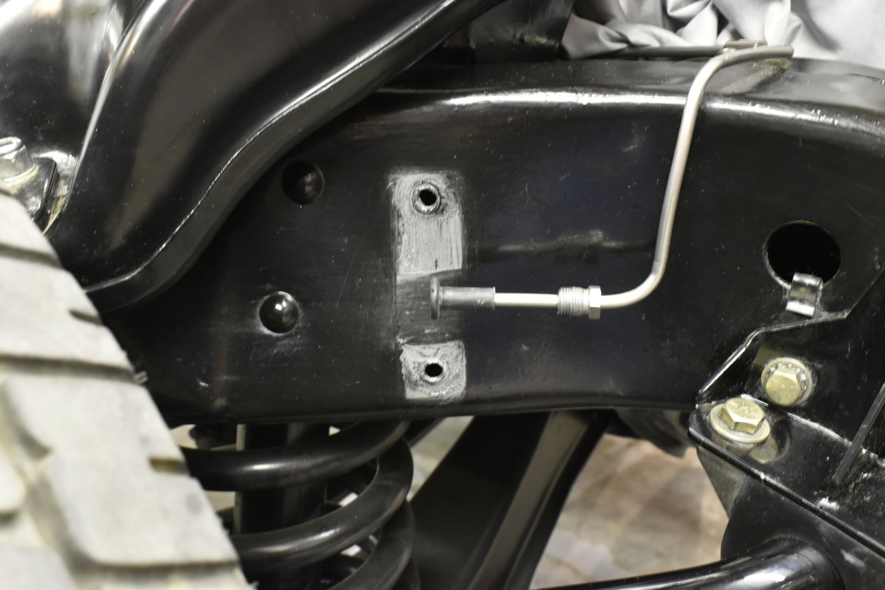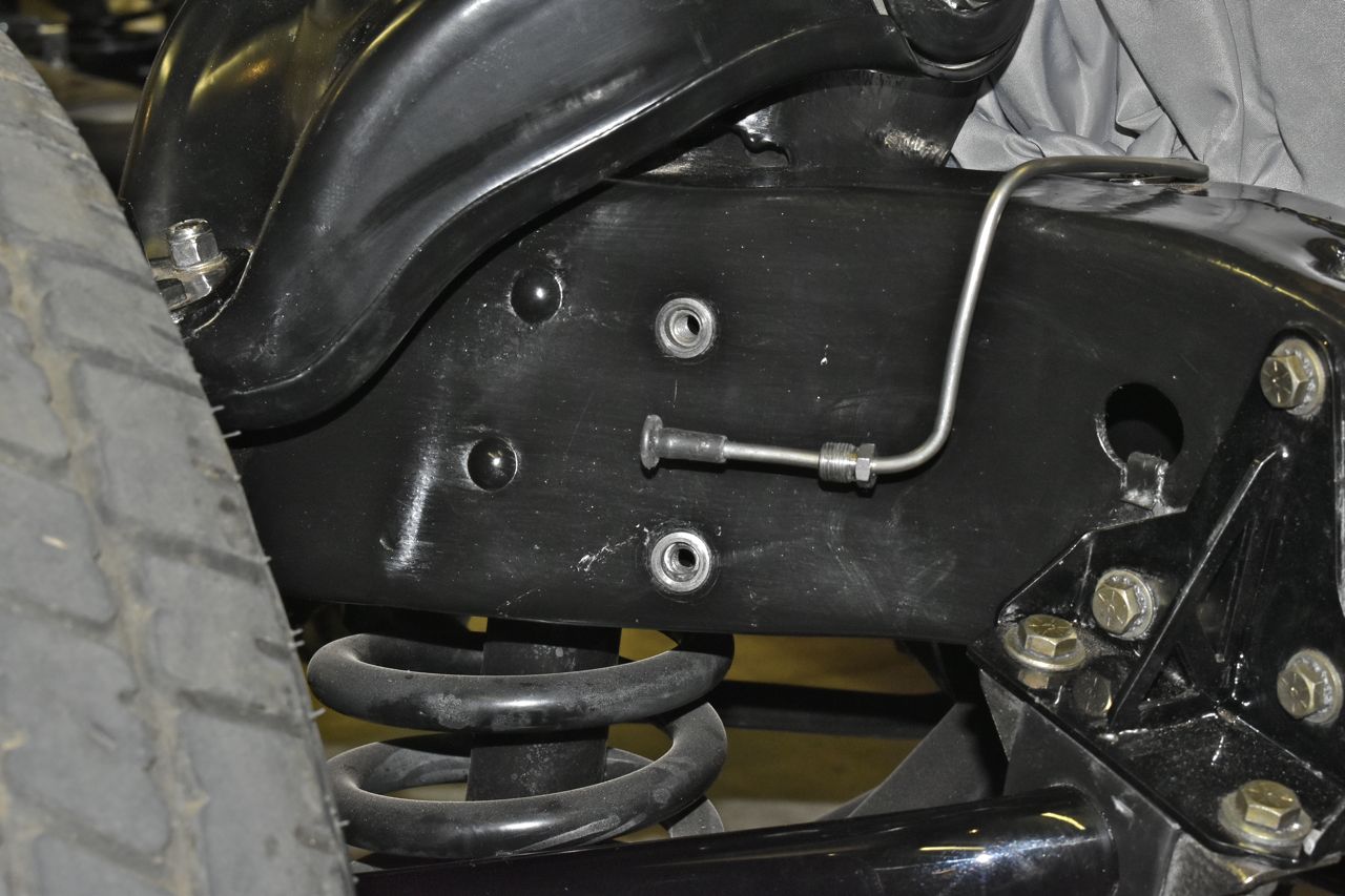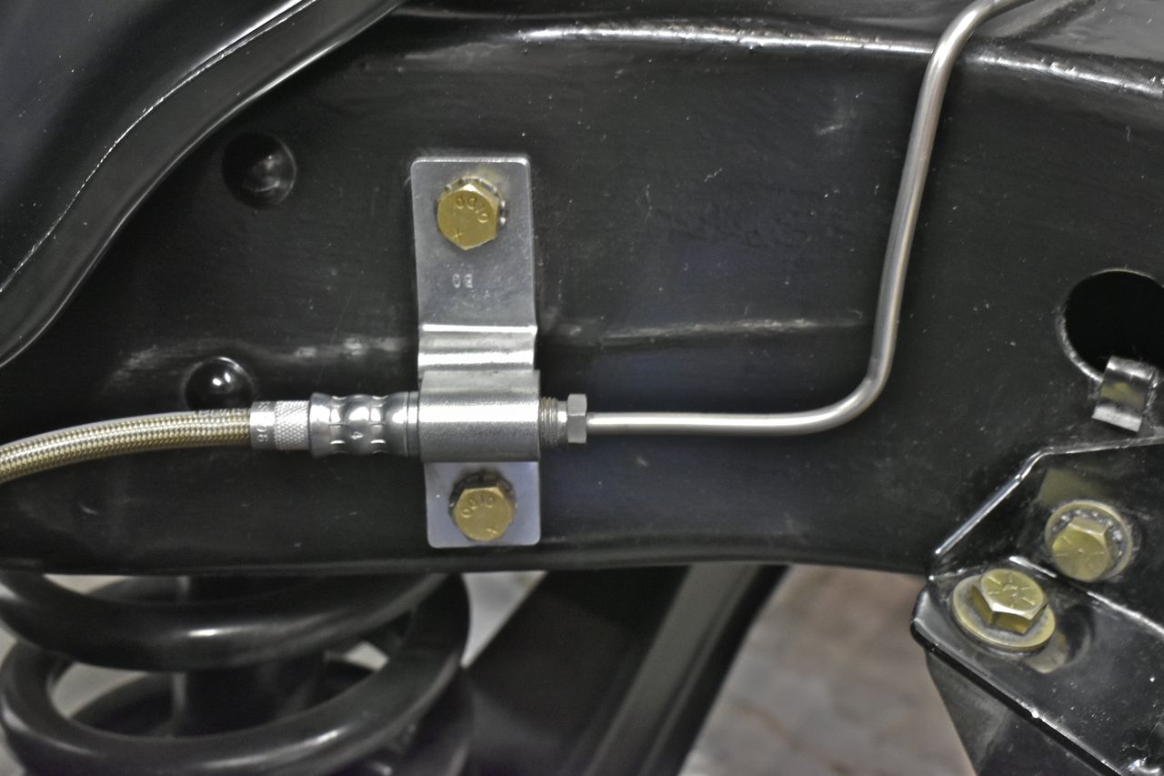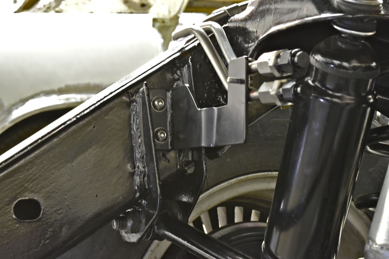 Originally I threaded the frame for fine thread bolts to secure items like this front brake hose bracket to the frame. I wasn't terribly fond of this and so I found a better way. Now when Ford bolted items to the frame, they punched a smaller hole then extruded it through the other side providing more surface area for the threads to take hold.