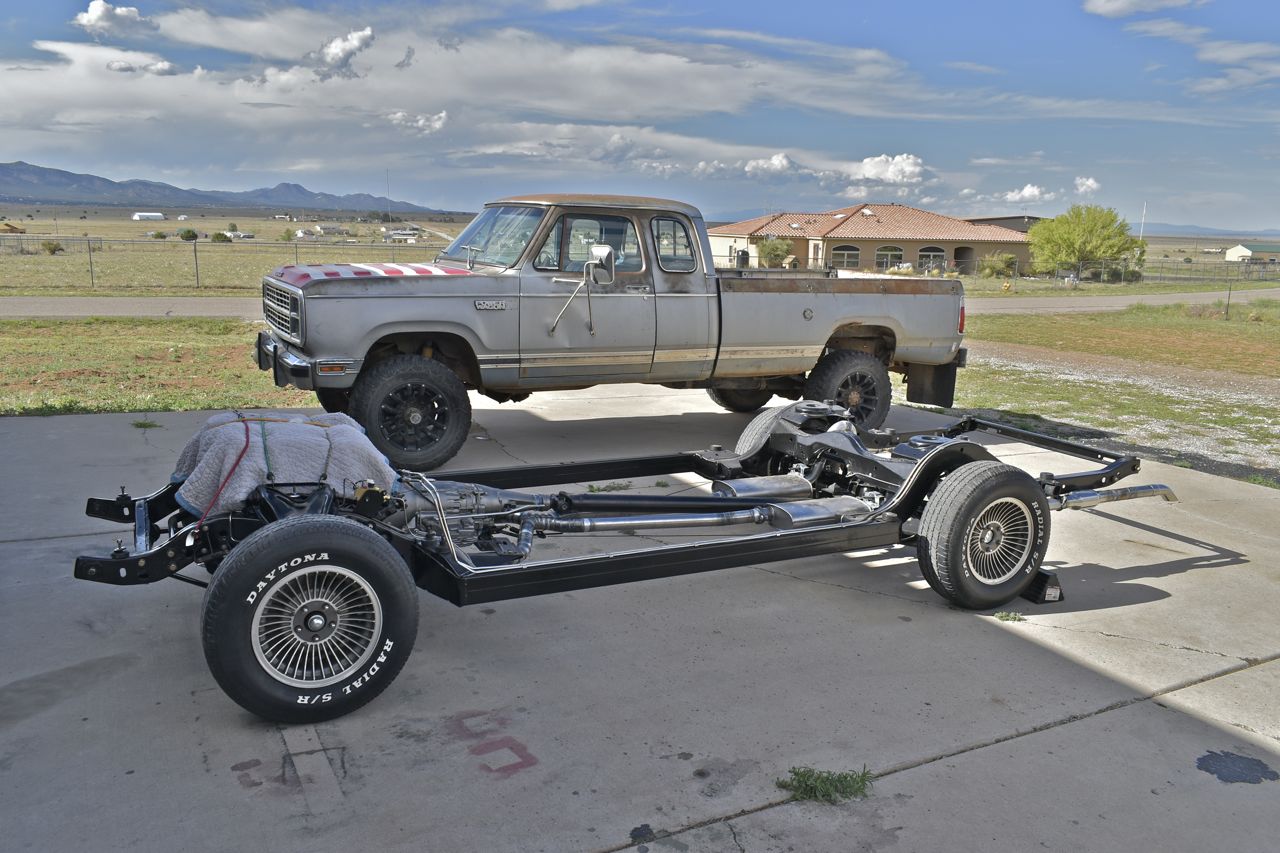 All it needs is the engine. The bare engine block here is my 390 block from my '68XL used as a place holder to mount the heads to in order to mount the headers and do the exhaust system.