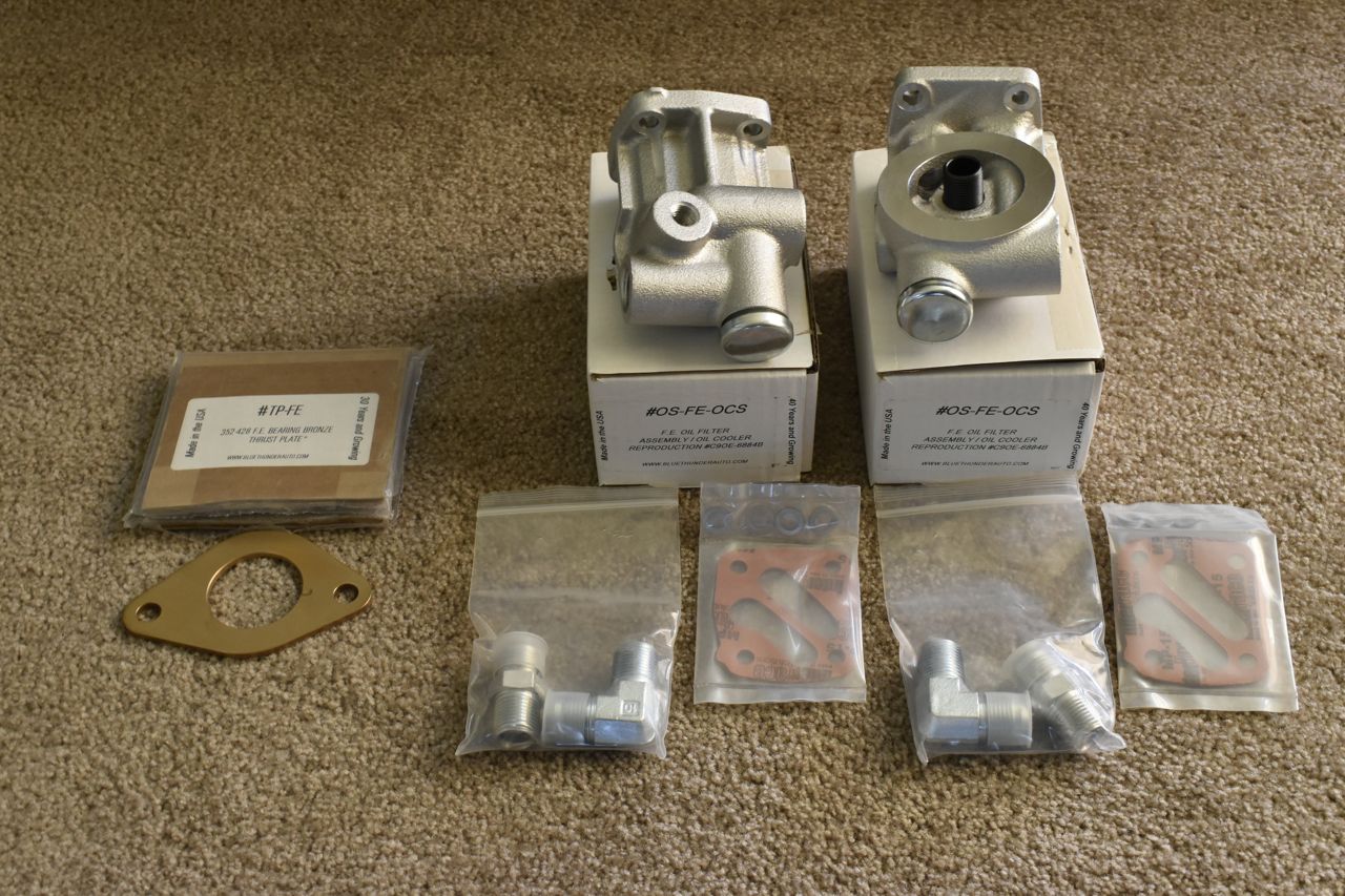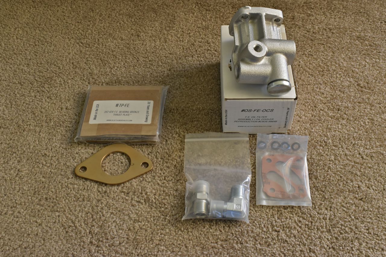 In this long duration of waiting on engine parts (pistons and cam) I was also waiting on Holman Moody for the FE super cobra jet oil filter adapter that has the oil cooler fittings replete with integrated viscosity by-pass valve. These are Blue Thunder reproductions. I also needed the bronze cam plate for the steel core camshaft as you can't run a steel core camshaft against the original steel retainer FE plate. They had the plate but I waited months for the oil filter adapter.