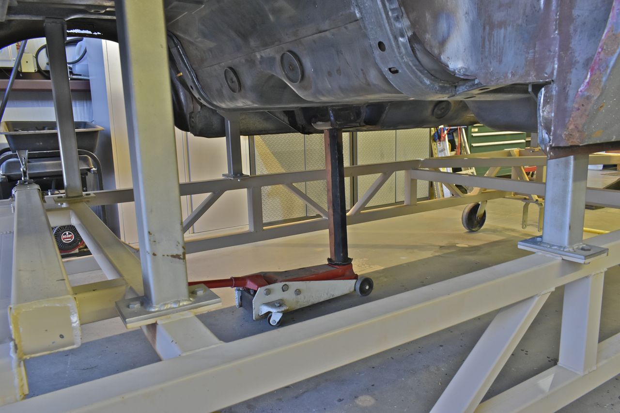 To squeeze the pan to the brace to plug weld I used the floor jack and a piece of wood to push up on the pan to meet the brace. The body jig allowed me to move around the jack easily.