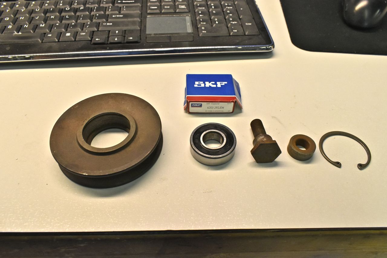 These are the same diameter pulley. I can use these pulley's and just toss the bolts, frames and standoffs. The bearing is a no name wanna bet it's Chinesium crap as there is more play than I'd like to see. With that they are a common bearing so I ordered Timken bearings to replace them. Still far cheaper than paying a machine shop to replicate the old California emissions idler pulley. I ordered quite a few of these from Rock Auto and cleaned them out as these were only 18 bucks each. Now I see they have more but are more expensive.