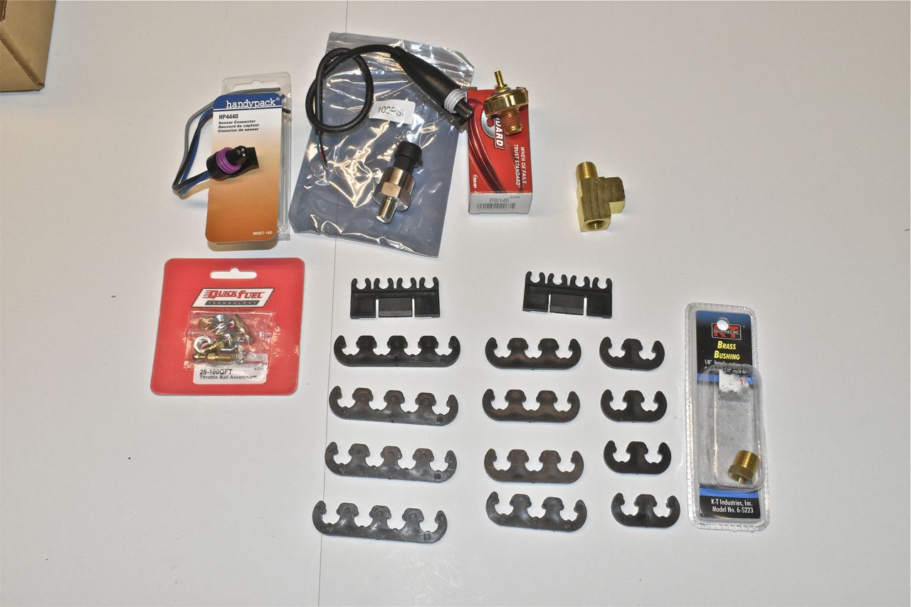 Some new bits. For oil pressure monitoring I'm using two senders; the cars original to directly drive the "OIL" lamp in the dash and a 0-100 PSI transducer. Also is a carb/TBI throttle cable ball assortment pack.