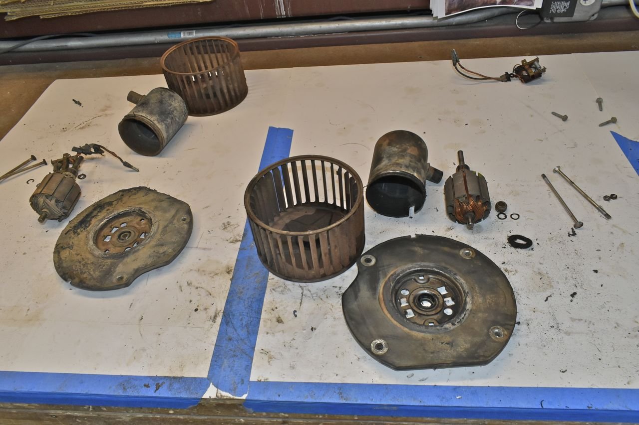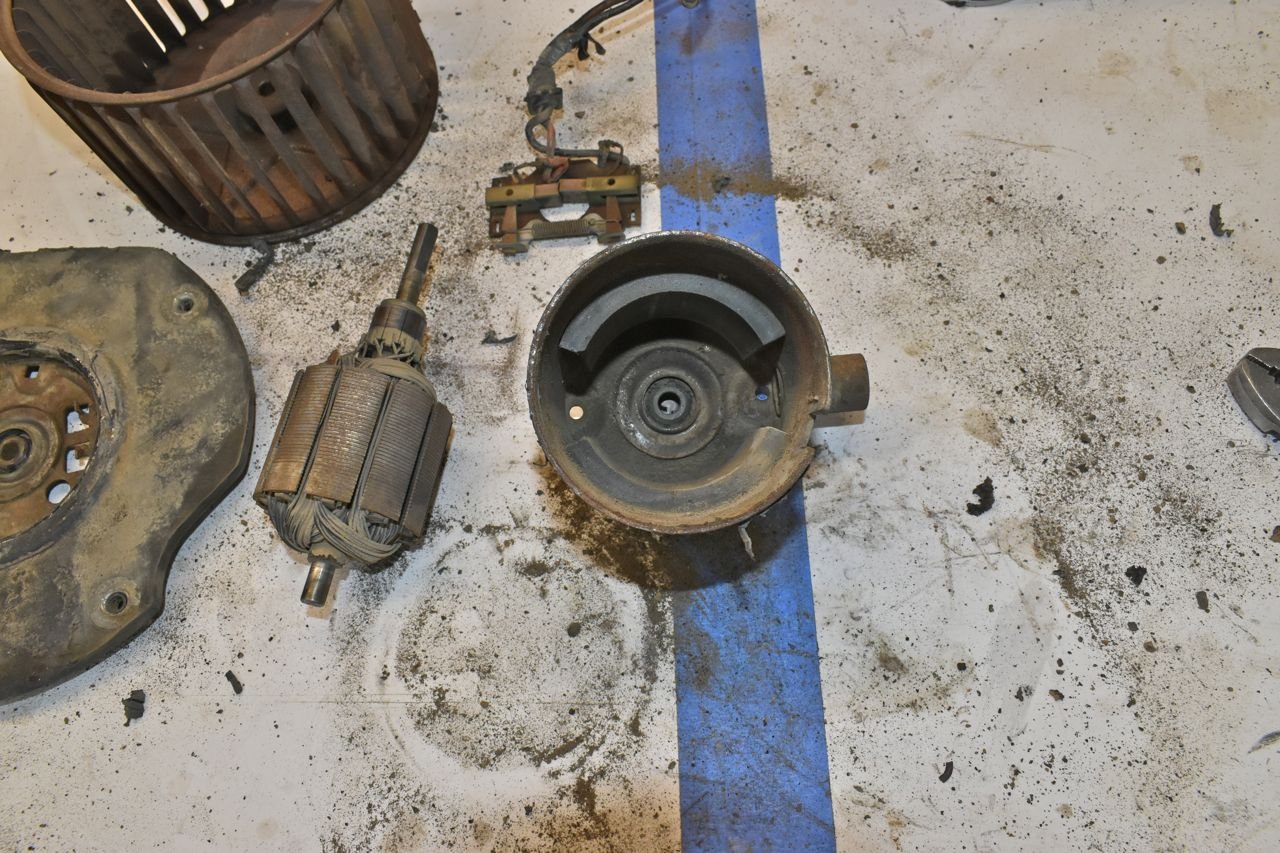 I decided to take the other '66 blower motor out of the other plenum and take it apart. Whilst not flame cooked, entropy didn't do it any favours either. Plus the front bushing just fell out. Great.... (sigh)