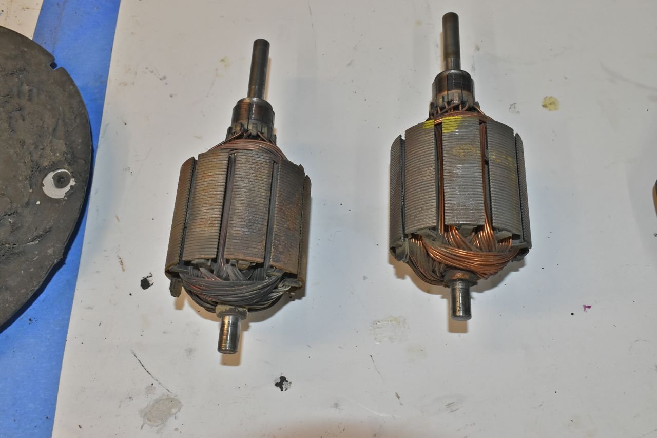 Time to dig into these. I took apart the front plates and drilled out the bushing retaining plates in these. Gosh you can see where the flames were wrapping around the motor shell in the one by all the melted rubber. Too funny.