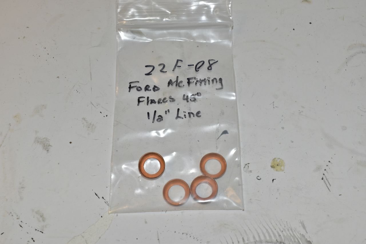 Here's an overlooked step. These are all old 45˚ single flares. There's a propensity for them to leak because the copper flare out of the evaporator is hardened copper and it's a hard brass expansion valve. Using this soft copper washers in between is a good insurance policy.