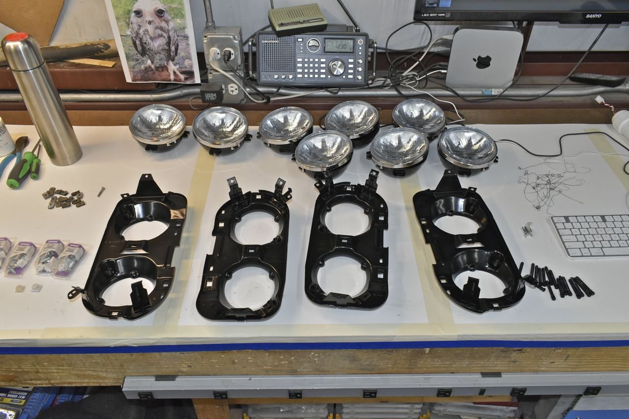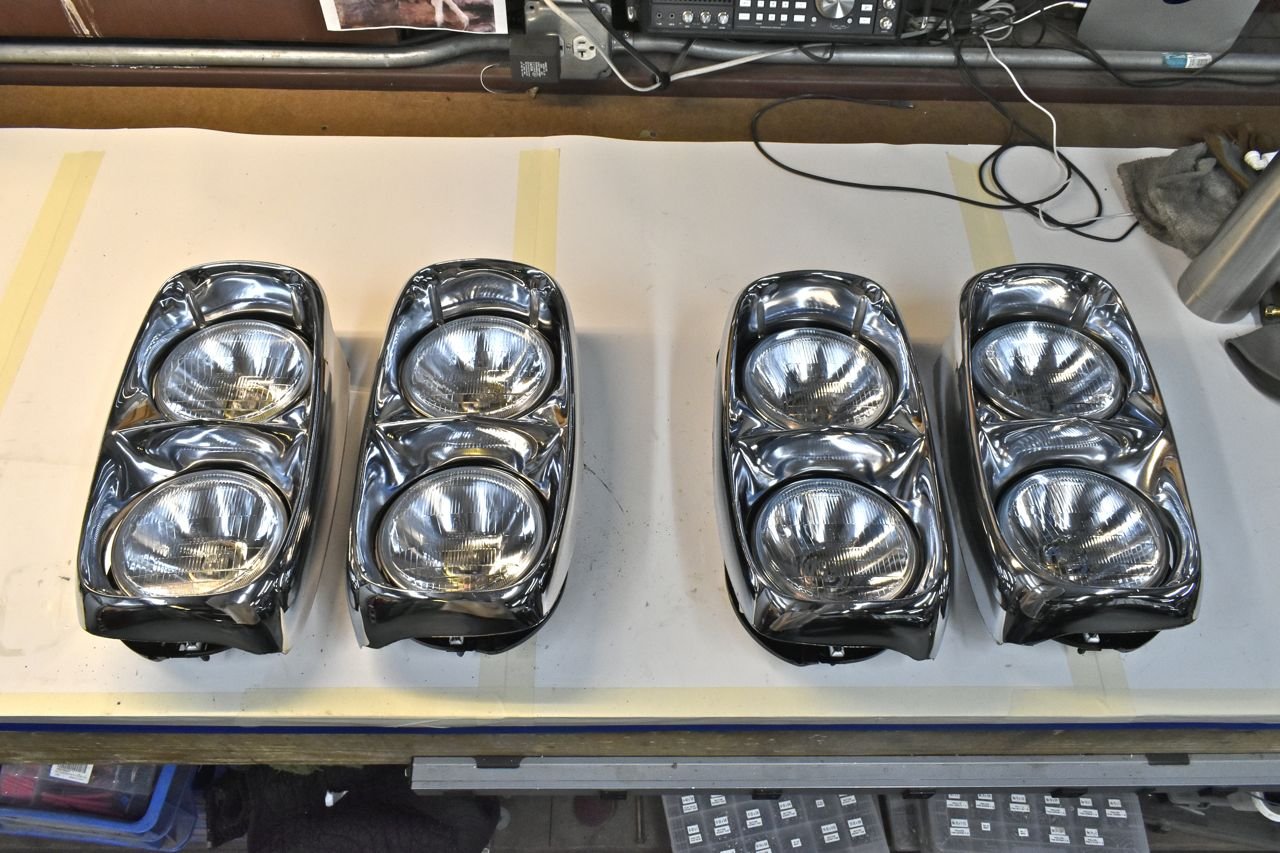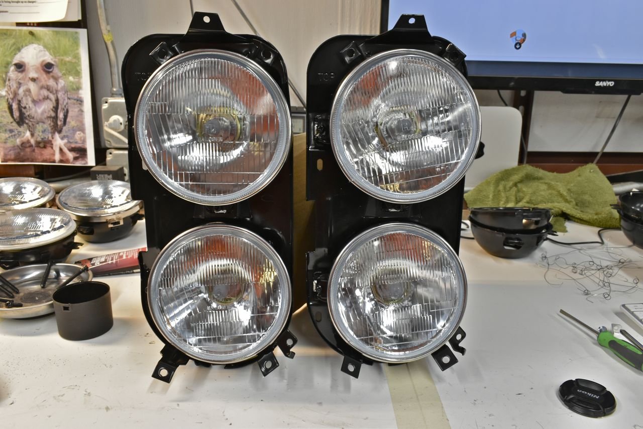 And here's two sets ready to go. At first glance you wouldn't know they are composite headlamps with 100 watt low beams and 140 watt high beams. They use standard H4 bulbs. And yes according to FMVSS 108 you can run 4 low beams if you wish. About the only limits are the intensity at certain beam angles from a federal point of view.
