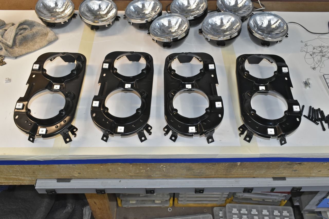 I stripped and powder coated the support plates for the headlamps as well as all the headlamp buckets. Now for the headlamps and buckets. The headlamps I am using is a composite glass and aluminum assembly. The only problem is the aftermarket composite headlamps only come in Low/High so I had to use the extra low/high buckets from all the spare headlamps assemblies and ditch the high beam only buckets because they are keyed to the bucket differently.