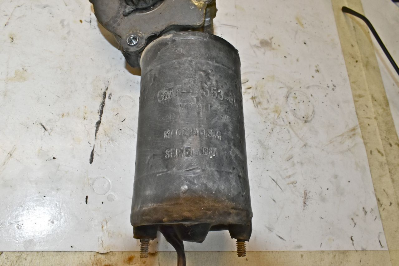 The old 1960's motor have an overmould of rubber on them (vulcanized). This is actually a bad thing as it can trap water underneath and cause the motor to rust away faster. As I previously mentioned Hancock made the regulators and motors for Ford. In looking at the rubber overmould, it simply wasn't dipped but rather it was an actual steel injection mould with a type set capability to denote the part number and date of manufacture. I have surmised why Hancock did this, on an economic model it's cheaper than painting and having to seal the end caps to the motor shell. So they forwent the painting for rust protection and just went with a rubber overmould with the part number and time stamp as part of that process.