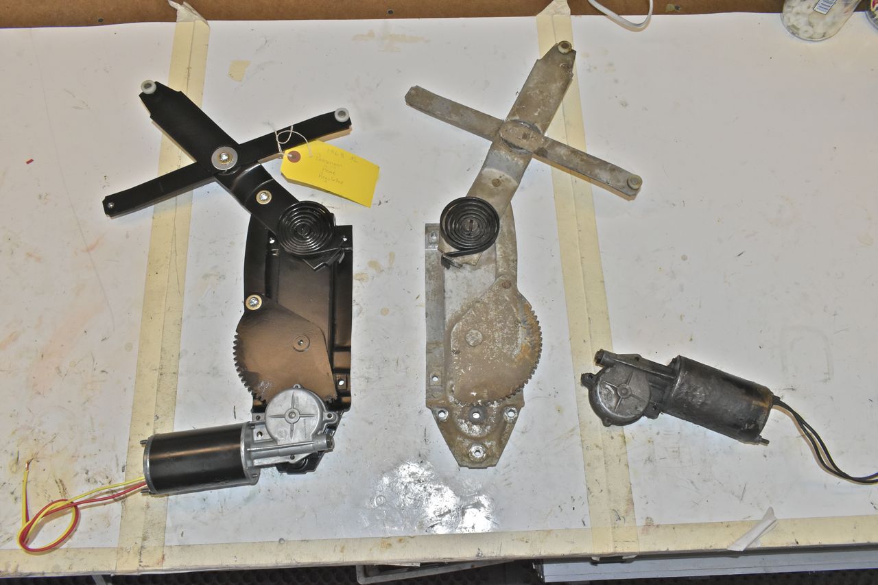 These 4 power windows are also interesting. They look darn near similar and for the most part they are. The 2 on the left are for the rear doors of a 1965-1968 4 door hardtop or sedan whilst the 2 on the right are only for the 1968 2 door rear quarter windows. In refurbishing these I did learn that they are identical with the exception of the length of the swing/equalizer arm. That's it. That means if you couldn't find 1968 2 door rear quarter regulators you can use 1965-1968 4 door regulators (the rear doors) and just shorten the swing/equalizer arms to match the manual regulators in the 1968 2 door. Or vise versa. Although you're more likely to find 1965-1968 4 door regulators than you are 1968 2 door quarter window regulators. It took me several years to finally find 1968 2 door coupe power regulators.