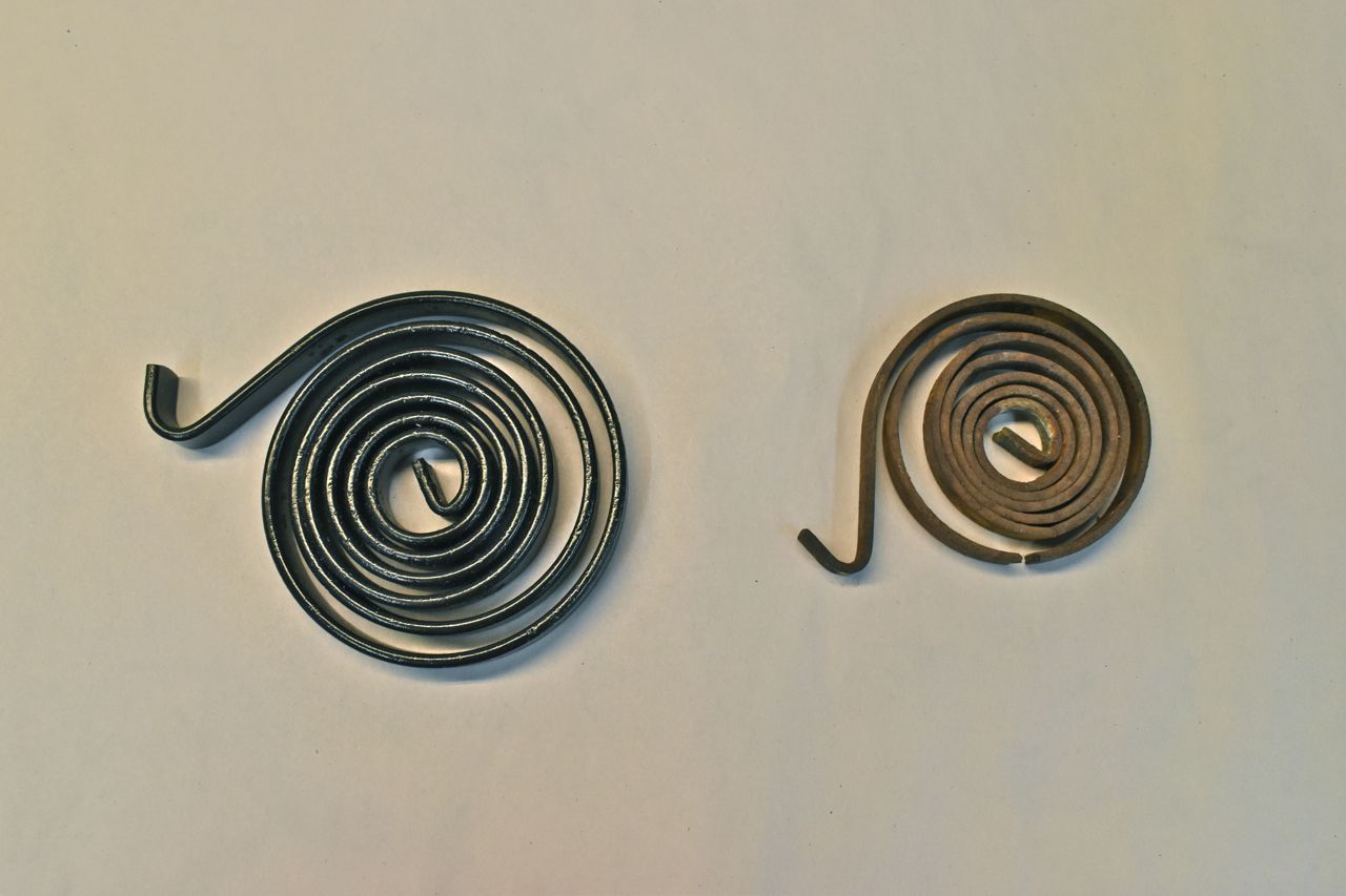 I would like to spend a moment on the window counterweight spring. It's a seemingly trivial part but there is a problem with them. The main problem is corrosion. It appears Ford never painted these, at best they were coated with an oil or grease and after 50+ years it's long gone leaving the spring metal to pit badly in certain conditions.