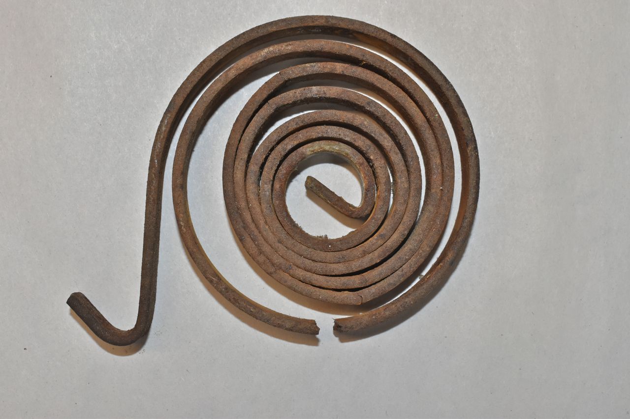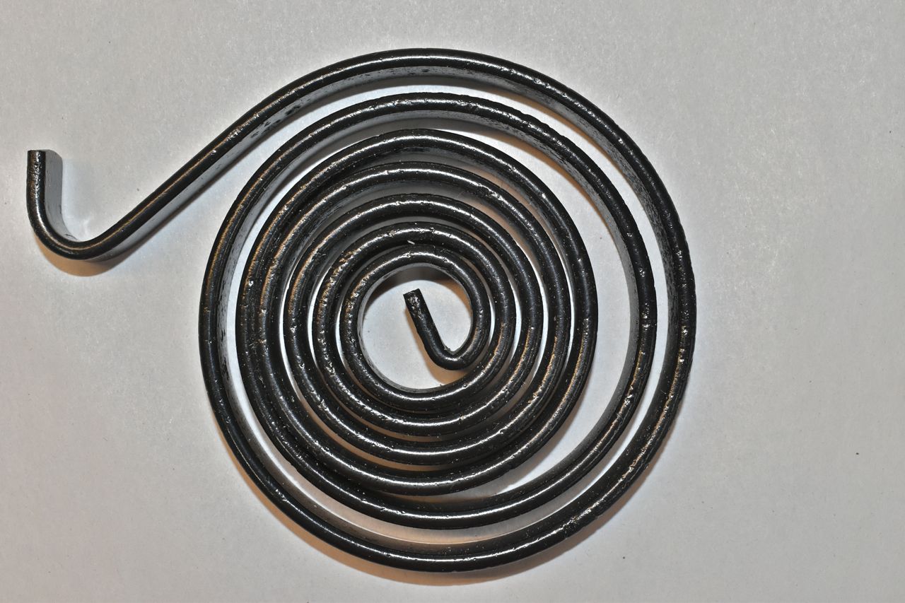 Or under light pitting conditions it may fool you. This spring is cracked and would probably let go with violence if you tried winding it back up on the regulator fully. Ironically this was intact on a regulator but did not fracture (stress fracture from pitting) until I removed it. I didn't realize it at the time. It went in an electrolysis bath to remove all the corrosion, sand blasted, then painted. When I went to start winding it back up, it made an unholy noise and at that moment I felt like I was staring down the barrel of a loaded gun. I carefully unwound it and you can see where it cracked by the distortion.
